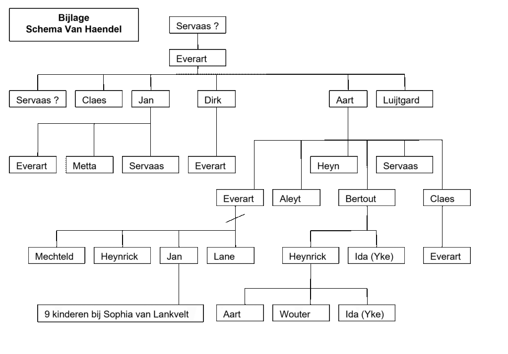 Opmerking bij vermeldingen 2, 5 en 6: Het huis en hof in De Deel aan de dreyboom (elders genoemd De Deelse Boom) was kennelijk aanvankelijk verworven van Michiel Jacobs door Art Everarts van Haendel. Later komt het in handen van diens kinderen Claes, Aleyt en Hendrik. Hendrik (dan genoemd Hendrik zoon wijlen Art van Haendel) koopt er in 1473 een stuk grond bij van 2 lopense, dat er aan grenst, van Willem Willem van Mercsel. In 1481 wordt het geheel overgedaan aan de kinderen van Hendrik Bertout Arts van Haendel. Uit deze vermeldingen, maar vooral uit nr 6 kan worden geconcludeerd dat Hendrik Arts van Haendel en zijn vrouw Engel geen kinderen hadden.