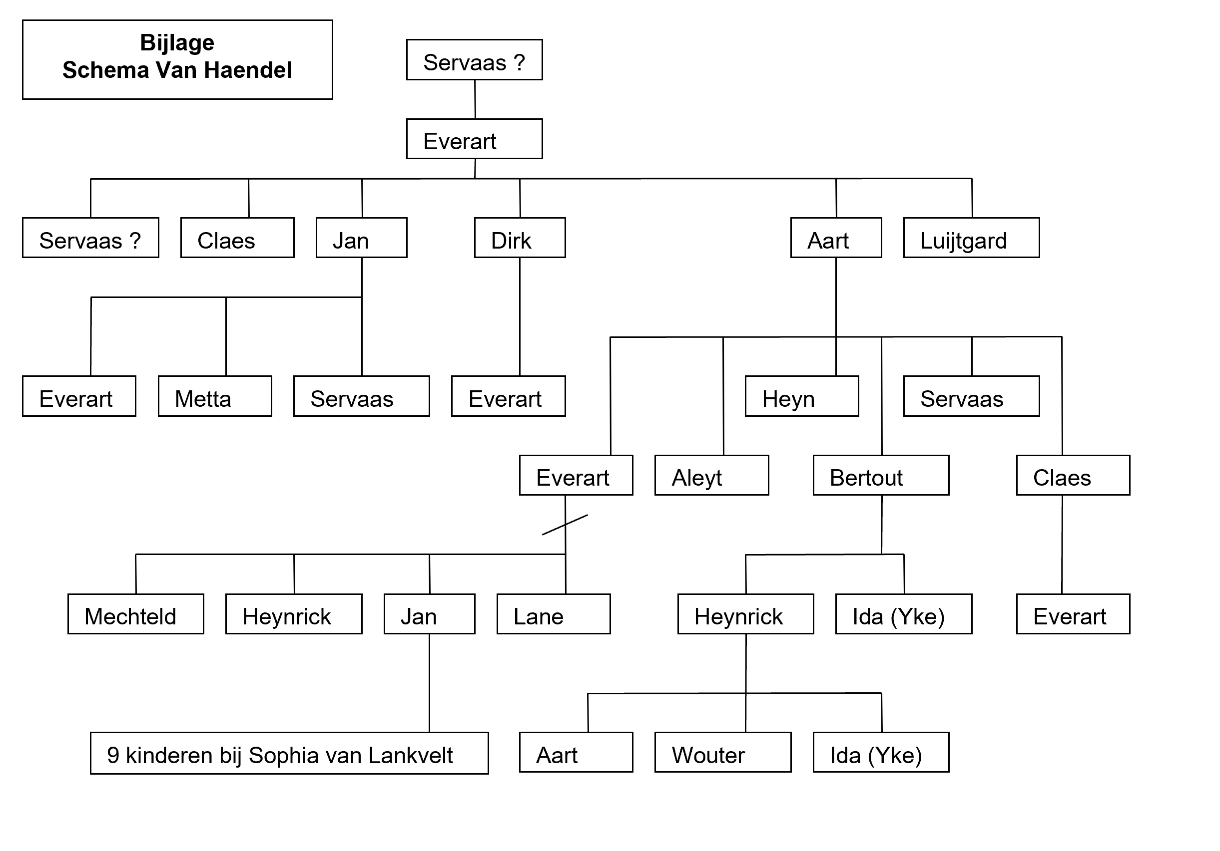 Zijn naam is fictief. Er is geen expliciete vermelding van de vader van Everart bekend. De naam komt echter voor bij twee achterkleinzonen: Servaes Jans van Haendel en Servaes Aerts van Haendel. De naam Claes komt ook in aanmerking, want die komt voor als een zoon van Everart en als diens kleinzoon Claes Aert van Haendel. Beide namen, Servaes en Claes, komen in aanmerking als vader van Everart. De ander naam zal afkomstig zijn uit de schoonfamilie van Everart.